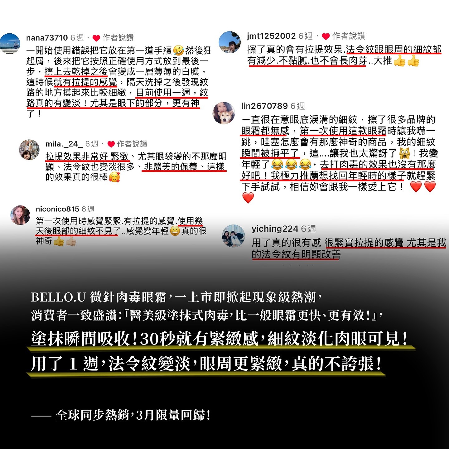 2分鐘前韓國最新科技【微針肉毒眼霜】✔️ 淡化細紋 ✔️ 暗沉改善 ✔️ 不黏膩、吸收超快 ✔️ 馬上有感、懶人保養 - 【體驗套装】3入組-NT$1090,還剩13組!!!